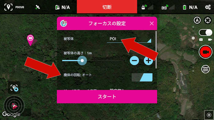 FOCUS の動作は、Orbit POI の様に被写体を定め自動で円飛行をするのではなく、被写体を定めますが機体の移動操作は手動で行います。