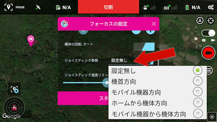 ジョイスティック参照 で「モバイル機器から機体方向」(D-Aベアリング) を設定・・・自分を中心に移動します