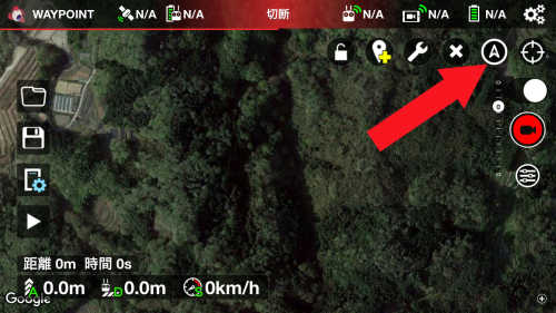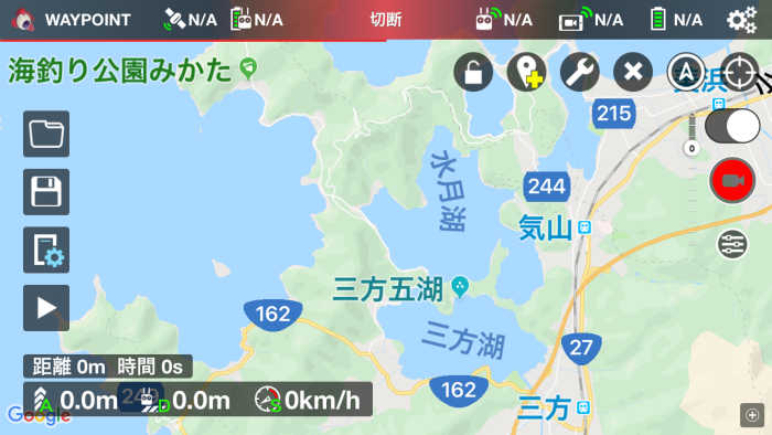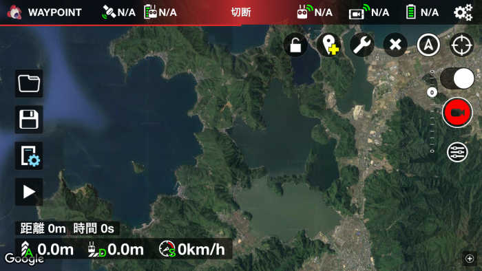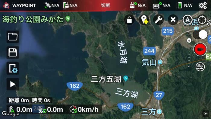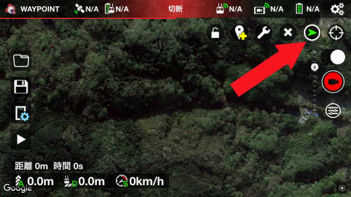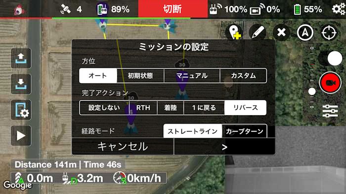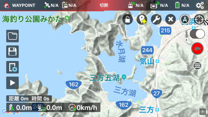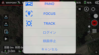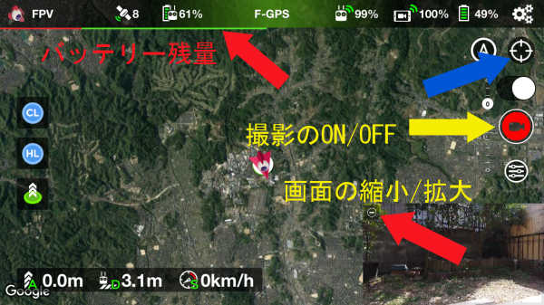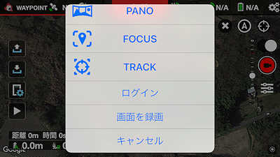 ミッションを実行した時は、中間地点1を通過すると、残りの飛行可能時間が表示されます。 - 撮影のON/OFFは、アイコン全体が赤い場合はOFFの状態です