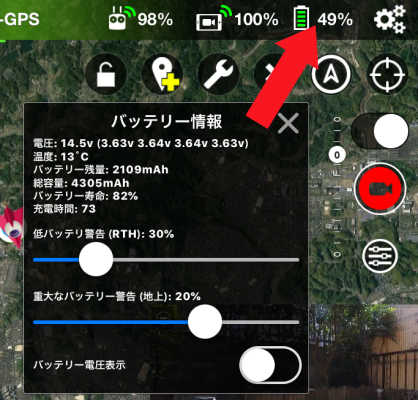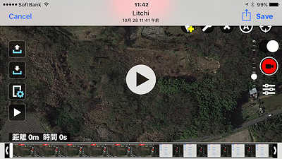 ios用 test版(iPhone) Litchi の録画機能を使って画面を録画。 H264 1600x900 48.89fps 残り飛行可能時間 現在のバージョンでは数字表示もあります |