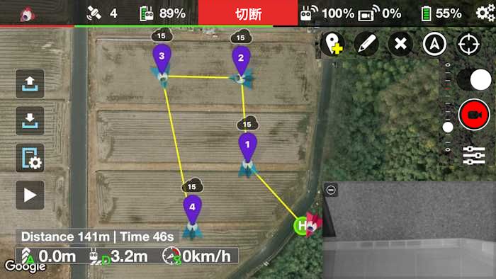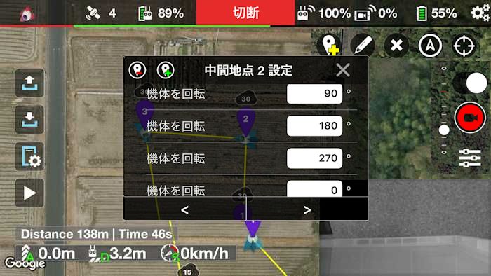 上記ミッションの中間地点の2と4に機体の回転を指示したので、動きと記録の様子がわかります。