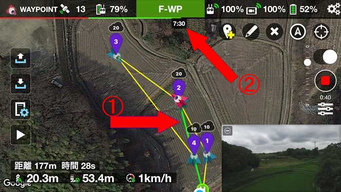 ミッション(フライトプラン)を実行し、中間地点1を通過すると、残りの飛行可能時間(矢印②)が表示されます。