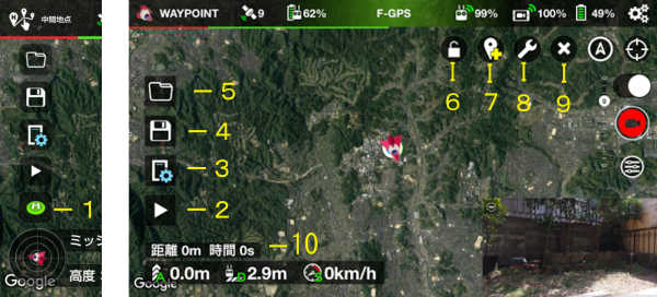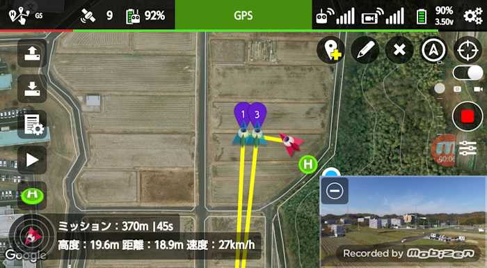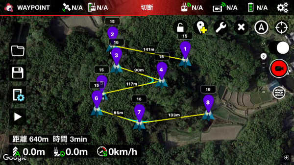複数の通過地点を地図上に配置して、自動飛行の為のミッション(フライトプラン)を作成し自動操縦を行います。