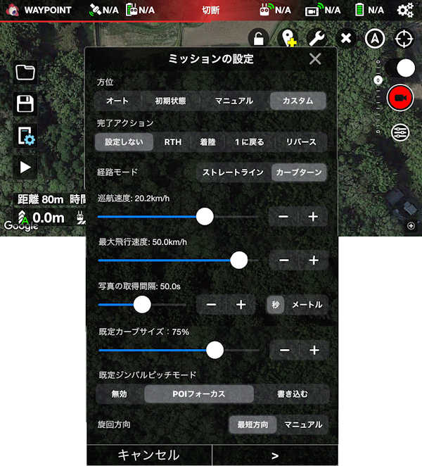 方位とは進行方向に関係なく、例えば常に南の方を向いて飛行します。 - 「カスタム(中間地点の定義)」・・・中間地点ごとに「POI番号指定、POI指定しない、方角指定」の設定ができます。