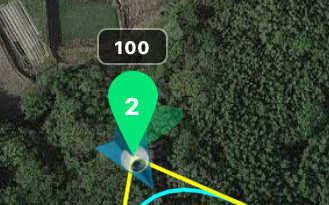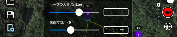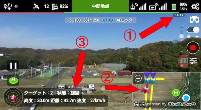 - (矢印③) 中間地点1と2の機体(カメラ)の向きが違う時は、機体はゆっくり旋回しながら飛行しますので、「状態:旋回」となっています