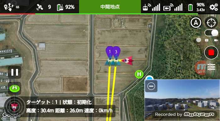 この時点では、バッテリー残量による飛行可能時間はまだ表示されていません - 地図の画面と カメラビューの画面を入れ替えて表示させています