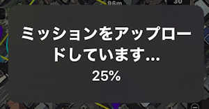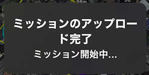 ミッションに、高度や飛行範囲等のエラーがある時は、転送量が 0% の状態でエラー表示され中止します。ホバリングしている時はエラーの内容を確認し、手動操縦で着陸させます。 - 100%アップロードされるとミッションが開始されます。データ数が多い時はアップロードに5秒前後かかります。