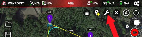 通信が切断する可能性がある場合は、確実に通信可能な中間地点(WayPoint)で希望するジンバルピッチ(上下角度)の設定をして「書き込む」にしておきます。どこで通信が切れるかわからない時は、当然この後の中間地点(WayPoint)も同じ設定をしておきます。