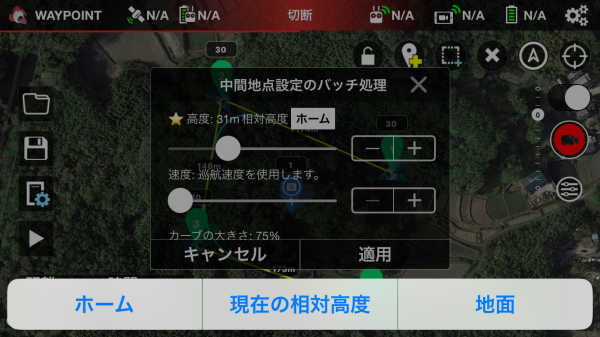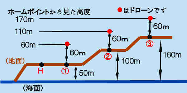 「地面」の良いところは、飛行場所の高度がわからない時でも自動で計算してくれるので、これを利用して希望の飛行高度を設定しやすくなります。