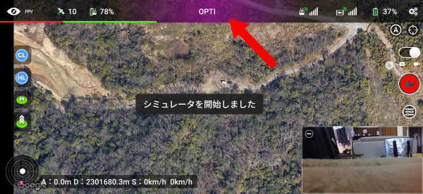 トップバーの背景色が紫色に変わると、ドローンがシミュレーターモードになります