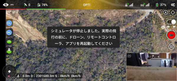 シミュレータモードを終了して実際の飛行を行う場合は、ドローン・送信機・アプリを再起動する必要があります。