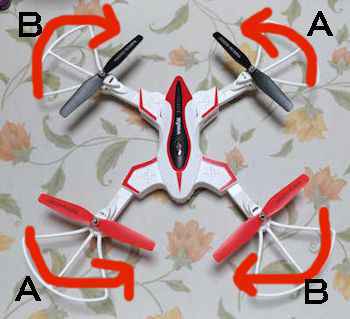 プロペラの取り付け方向 プロペラ交換時に違った向きに取り付けると、飛行できませんので確認が必要です。 前後左右から見た時、必ず隣同士のプロペラのひねりは逆を向いています。 プロペラの表面に、AやBのように記号が刻印されています。 私はこの記号が見えづらいので、プロペラのひねりの向きで取り付け位置を確認しています。 |