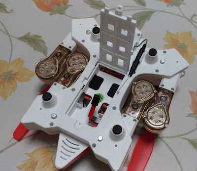 片側を持ち上げる為に、私は片方の辺に 5mm厚のスペーサー(板材)を仮付けしました。 厚くしたり、薄くしたりして調整します。 厚過ぎるスペーサーを取り付けると調整しすぎてしまい、 機体が上昇できなくなってしまいます。 |