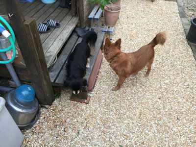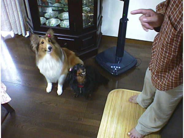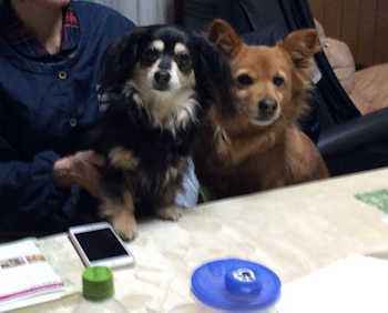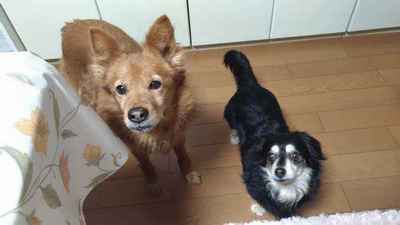 おやつをもらおうと構えてるアミとハナ。最近はケンカもせずに仲が良い。