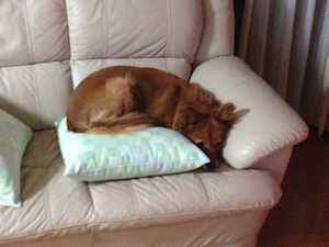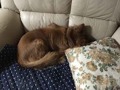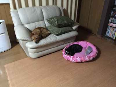 それぞれがお気に入りのソファーでのんびり昼寝。ハナはソファーの肘掛を枕に気持ち良さそう。