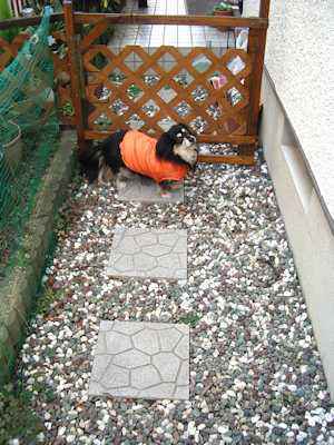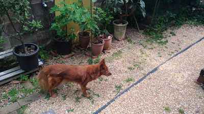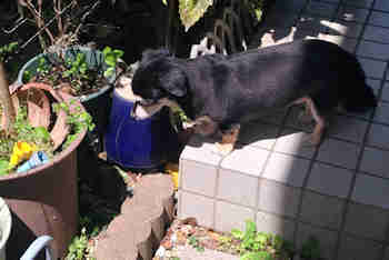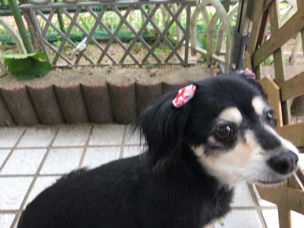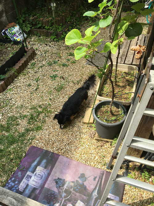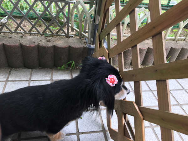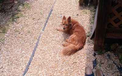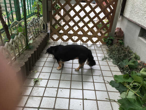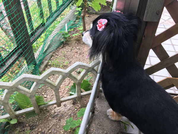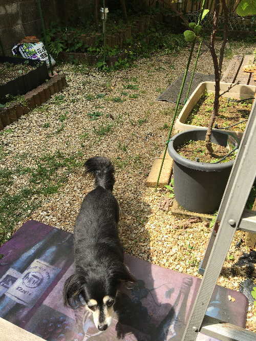 庭で作業をしているのを、横で見学している愛犬のリカ。室内犬なので庭で遊ばせると大喜びで邪魔ばかり。