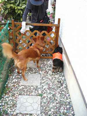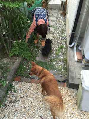 嫁さんが帰ってくると、「アミ」は一目散に飛び出し、「ハナ」はその後を追いかけていく。