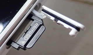 nanoSIMカード や MicroSD を取り付けているトレーを引き出す時に、ピンを指してケースの頭が出てくるタイプとは異なります。