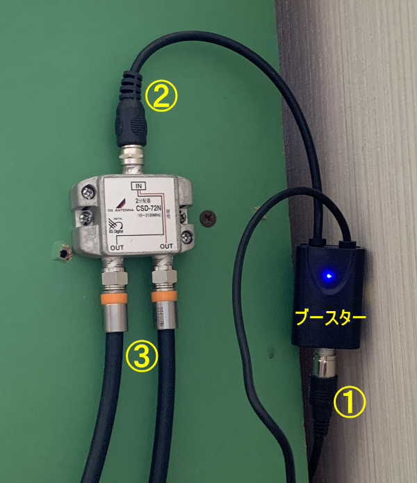 アンテナからのケーブル①をブースター(付属の増幅器)につなぎ、出力の②を分配器に接続しています。