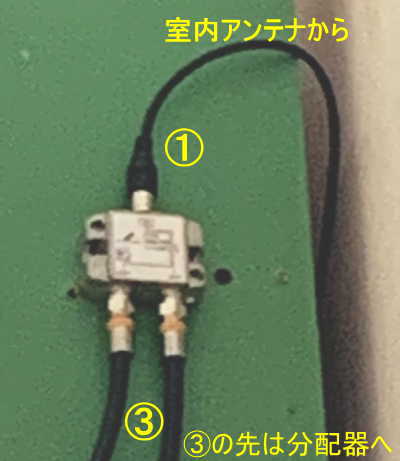ブースターを外して、ケーブル①を分配器の入力へ繋ぎ、分配器からの出力③の先は、さらに2分配器、3分配器に接続されています。