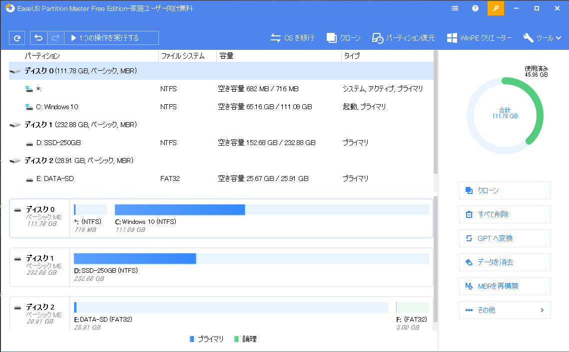 ディスクやパーティションをクリックすると画面右上の円グラフで、総容量・使用済み容量・使用比率が確認できます - 画面右側のメニューは指定したディスクやパーティションに対して実行されます