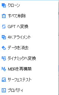 ディスクやパーティション上で右クリックして表示されるメニューの表示項目例です。