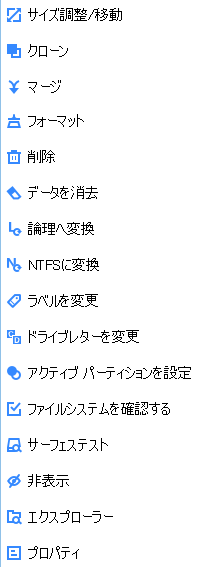左側画面で選択したディスク本体やパーティションによってメニュー項目数が変わります。