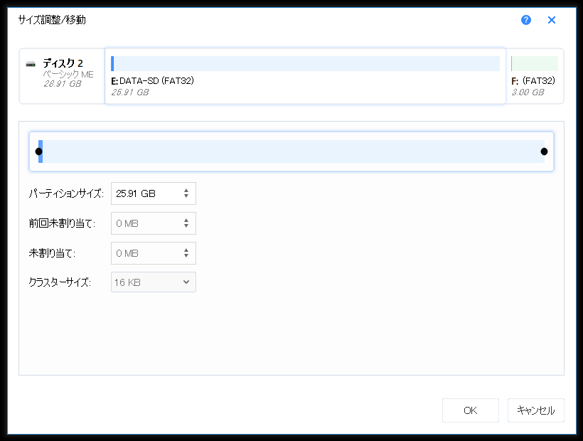 左右どちらかに「未割り当て容量」があれば、現在の領域をクリックして左右に移動もできます。
