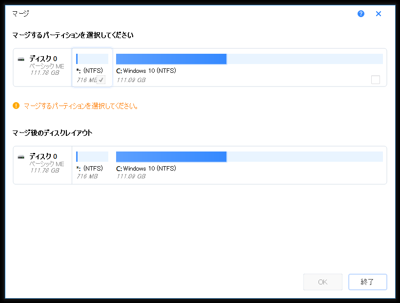 2つのパーティションが隣接のパーティションでなければ結合することができません。