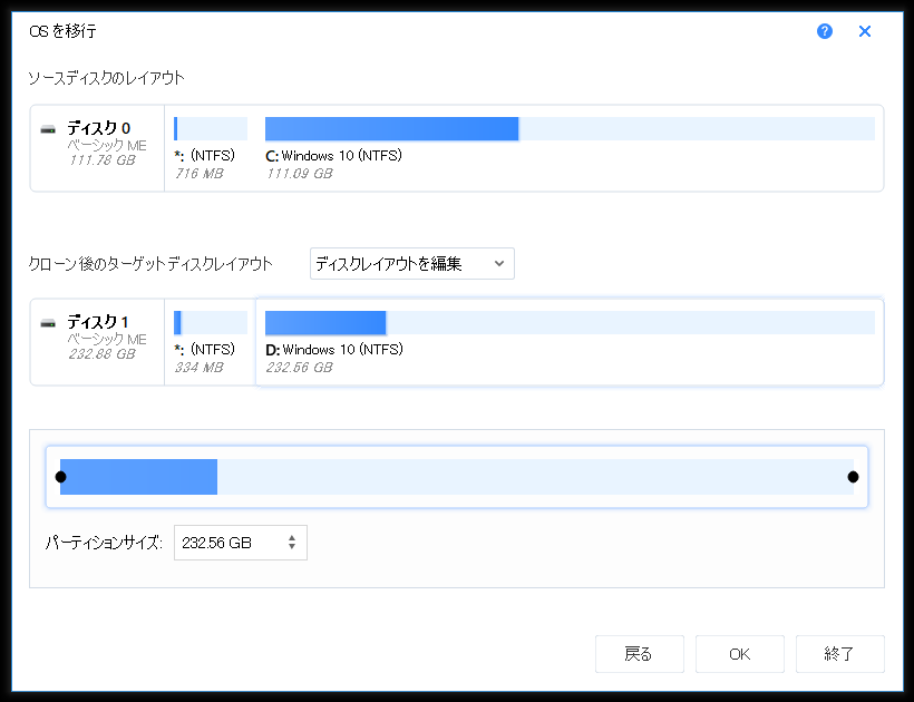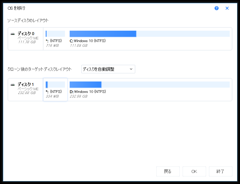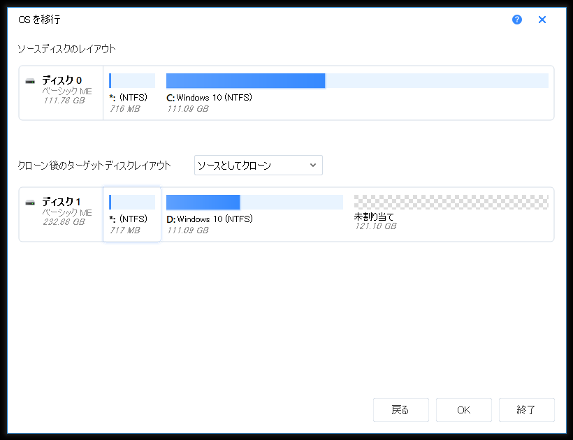 - 「クローン後のターゲットディスクのレイアウト」が参考表示されます