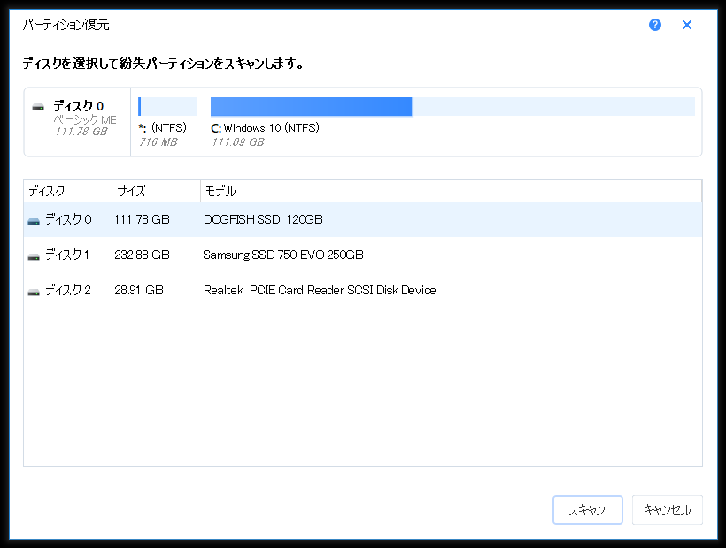 - 復元したいディスクを選択し、「スキャン」をクリックすると即実行されます