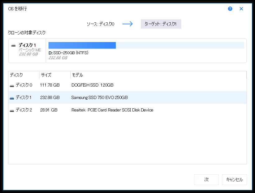 - 現在のHDD/SSDが接続された状態(レイアウト)が表示されるので移行先ディスクを選択し「次へ」