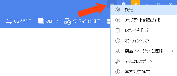 画面右側のメニューは、指定したディスクやパーティションに対して実行されます。