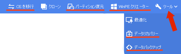 データリカバリーとデータバックアップをクリックすると案内が表示されます。