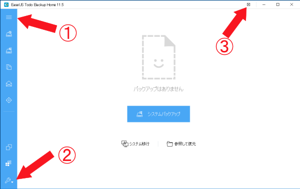 中央部には、主な「システムバックアップ」「システム移行」「参照して復元」が並んでいます。