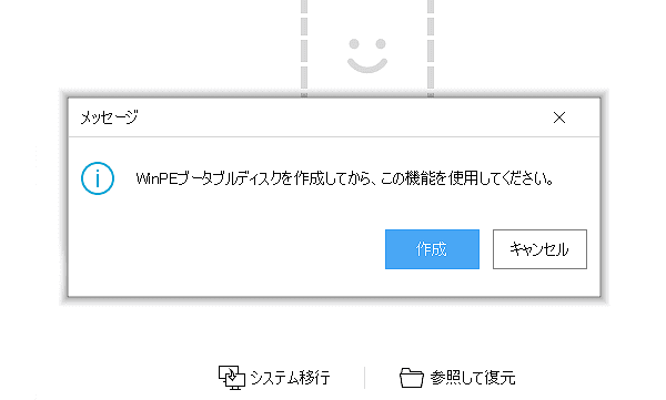メイン画面の「システム移行」をタップすると下記のようなメッセージが表示されました。まずブータブルディスクを作成する必要がありそうです。