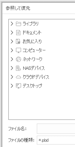 別の場所に保存されているバックアップファイル.pbd を指定する場合は、画面上の「参照して復元」をクリックします。