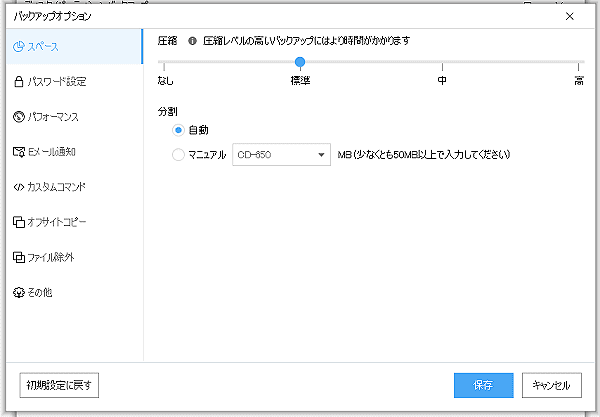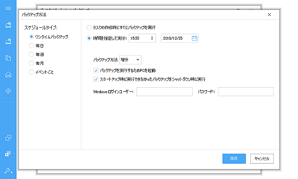 スケジュール や 完全/増分/差分バックアップ等の設定