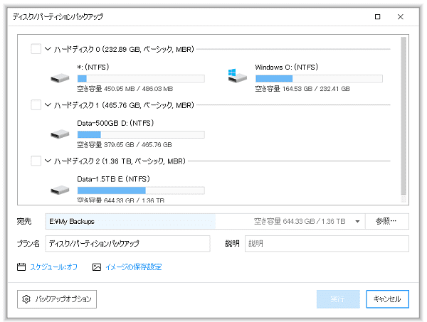 ディスク全体や、指定したパーティション の バックアップを行います。