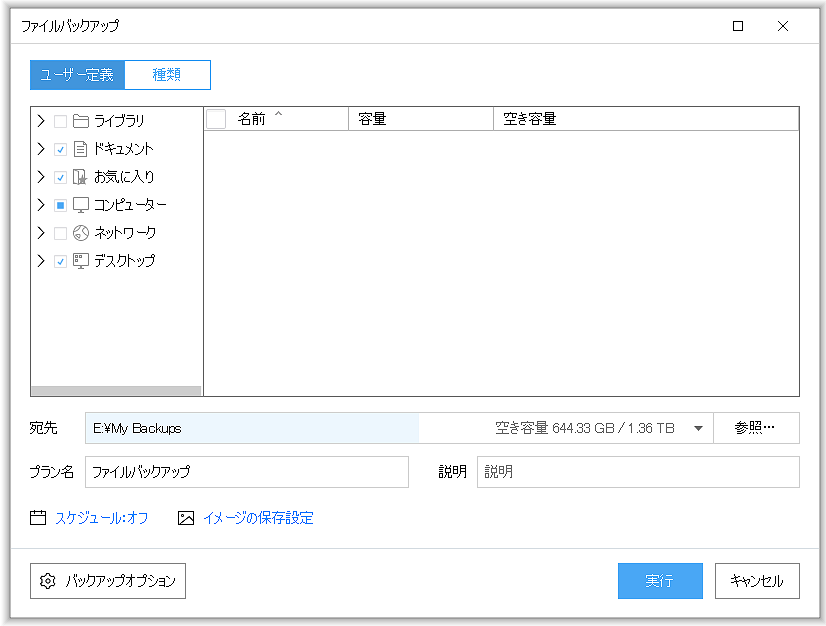 指定方法は、ファイル の バックアップと同じですが、「スケジュール」や「イメージの保存設定」「バックアップオプション」の設定がありません。