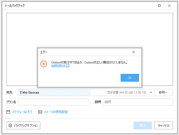 メール の バックアップは残念ながらOutlookを使用していないので、下記のようなエラーメッセージが表示されました。