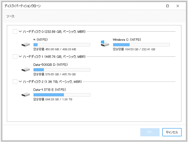 まず、クローンを作りたい元のソースディスクやパーティションを選択。