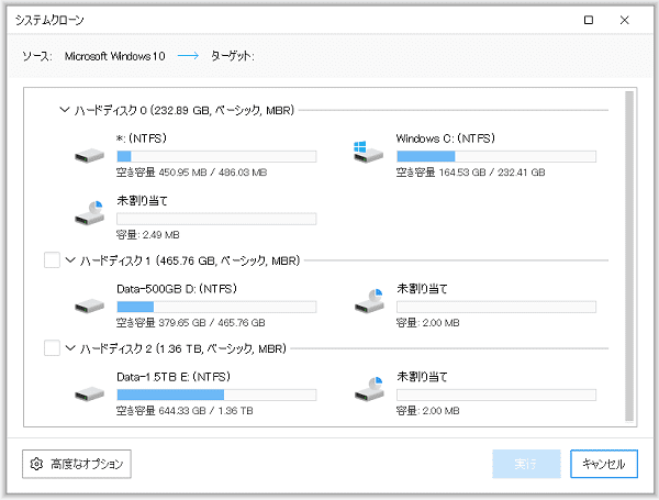 元のディスクに不良セクタがある場合は、「高度なオプション」をクリックし、「セクタバイセクタクローン」にチェックすると、うまくコピーできます。