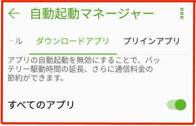 - 「最近のインストール」「ダウンロードアプリ」「プリインアプリ」の各タブで、「すべてのアプリ」の右にあるスイッチアイコンを一旦「OFF」にした後「ON」にします。