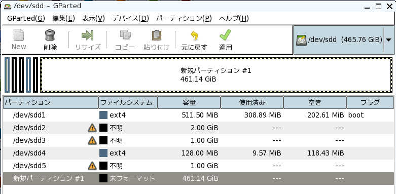 - 最後の6番目に新規パーティションができていますが、未フォーマットになっています