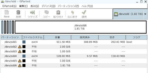 下記画像は、内臓HDDを交換した時に Linux の Gparted で確認したものです。