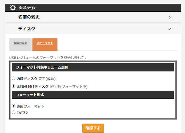 - 専用フォーマット・・Ext4形式でフォーマットされます。Windowsでは読み書きできませんが、「履歴差分バックアップ」ができます