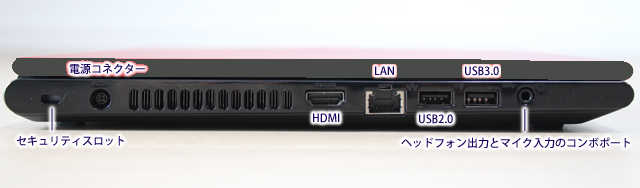 DC入力端子、HDMI ポート、LAN端子、USB2.0、USB3.0、ヘッドフォンとマイク