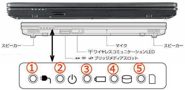 ①DC IN ②電源LED③バッテリーLED④HDDアクセス⑤メディアカードのアクセス