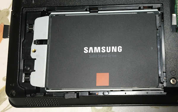 DVDのスペースにHDD変換アダプタを付けて、SSD+HDDのデュアルドライブにしています。